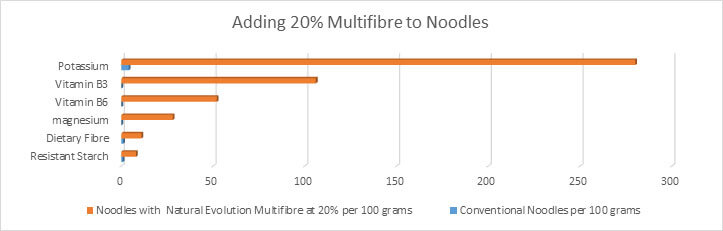 | Noodles, pasta, | Adding 20-30% creates new beneficial digestive noodles and pasta allowing lower Glycaemic Index ability. Gives gut health and prebiotic benefits. |